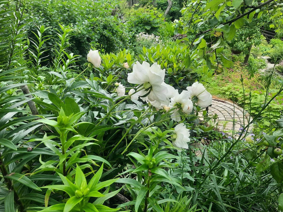 Пионы тут же стремительно рванули распускаться. Недавние бутоны в один миг превратились в огромные и не очень шапки. Первый пион отцвел раньше. Хотела его сюда тоже вставить, так интернет не дает! Дважды пробовала добавлять изменения роспуска на большом солнце, пустое дело, не грузится, и все тут! Так что покажу то, что цветет сейчас. Накануне фотографировала утром и днем. Разительные перемены! Сортов не знаю... Точнее, не все! Например, этот сорт мне совсем неведом. Пробовала узнать, пока не получилось. Это он "с тыла" такой непрезентабельный. А это уже "в лицо". Попал он ко мне по случаю. Соседка принесла пару побегов и оставила. Как раз у нас с мужем карантин был по известному заболеванию. Я приткнула в одно место, потом пересадила получше. Пока он не зацвел. вообще всерьез его не воспринимала! Поближе в полуроспуске. Бутон... Раскрывается... Еще побольше... Почти совсем полный роспуск. А так? Вот когда я впервые пару лет назад увидела это блюдечко, то впечатлилась! Третья попыт