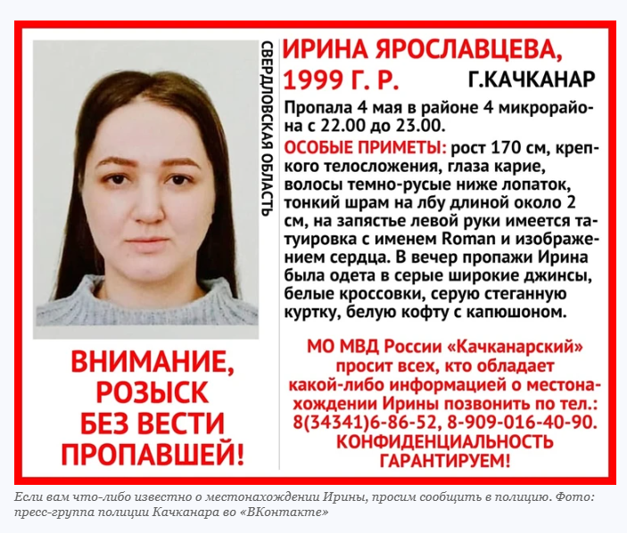 Ирину Ярославцеву, у которой остались двое детей 3 и 6-ти лет, не могут найти уже два месяца. По словам её сожителя Сергея, женщина вышла из дома 4 мая в 22:20 без денег и документов и просто исчезла... Изменилась до неузнаваемости По словам подруги Ирины, она резко изменилась после того, как сошлась с Сергеем. Всегда яркая, красивая, ухоженная женщина, вдруг опустилась, поникла и располнела. Пара часто ссорилась. Конфликты были очень жестокими, поэтому последние полгода дети Ирины жили у бабушки. Сергей пил и по пьяни часто избивал женщину. Он выбил ей зубы, вырвал клок волос и оставил шрам на лбу. Каждый раз Ирина вызвала полицию, Сергея забирали, но потом снова отпускали. Ирина ему всё прощала. «Плакала и просила её забрать» После исчезновения Ирины её подруга рассказала, что за месяц до этого она сильно поругалась с сожителем. «Ира позвонила ночью, плакала и просила её забрать. Но я тогда не смогла приехать и посоветовала ей вызвать полицию», - вспоминает женщина. Ирина так и сдел