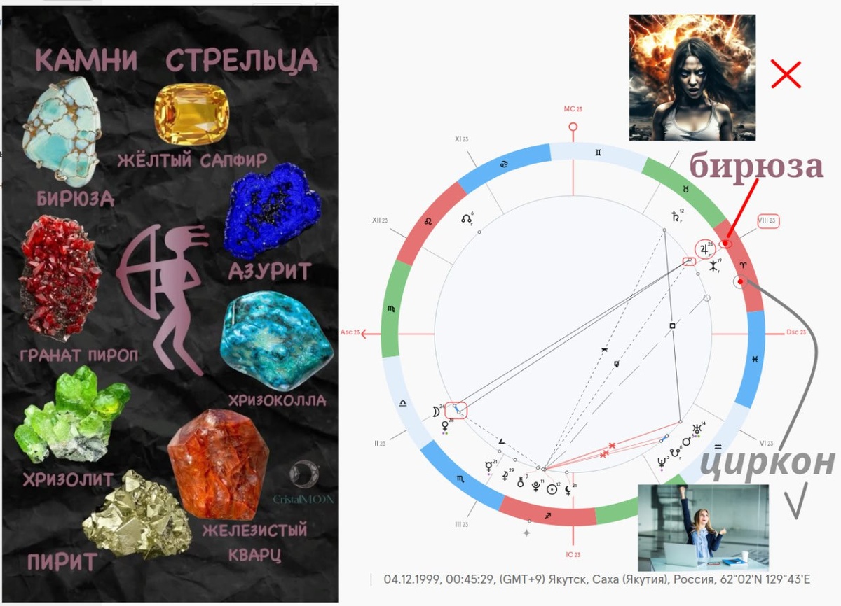 Действительность: Камень бирюза попадает этому конкретному человеку,стрельцу по знаку зодиака, в самое проблемное место его гороскопа - на негативную термоядерную точку Юпитера в 8 доме кризисов. Усиливая события травм, операций, депрессии, долговой ямы. Попав в сложную точку камень усилил проблемный кризисный момент конкретно его карты рождения. Если человек вывозит эти сложности, то получает ожидаемый бонус от ношения бирюзы в виде мудрости впредь в предусмотрительности и осторожности, с таким багажом опыта человек-стрелец уже будет бесстрашнее к трудностям судьбы. Если справиться...