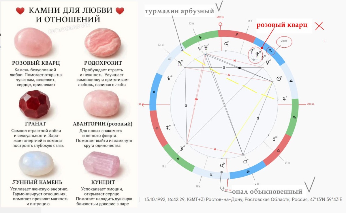КЕЙС №2 Дано: у девушки проблемы с мужчинами и она на просторах интернета находит инфу про камни для гармонизации отношений. Берет розовый кварц, так переписываемый из одного эзотерического сайта на другой сайт ювелирного магазина и далее в брошюрки на ярмарки мастеров, что самый лучший по планете венере для счастливой любви розовый кварц. Что на деле выходит: Розовый кварц таким положением активирует вулкан треша по венера-плутон в виде передряг любовных взаимоотношений, здоровья женских органов и пр. Как правильно: Опал обыкновенный (по звезде Аль-Хекка в созвездии дзета Тельца), чтоб мягко гармонично предоставит солнцу возможности подпитаться энергией. Солнце - элемент проблем с мужьями, напряженный. Если добавить гармоничной аспектации от камня усиливающего солнечный принцип, то отношения легче выстраивать за счет уменьшения той пелены вранья, недомолвок, агрессии и желания сбежать от близости, оставить во френдзоне, что зашиты в базе сложностей данного Солнца. Еще вариант турма
