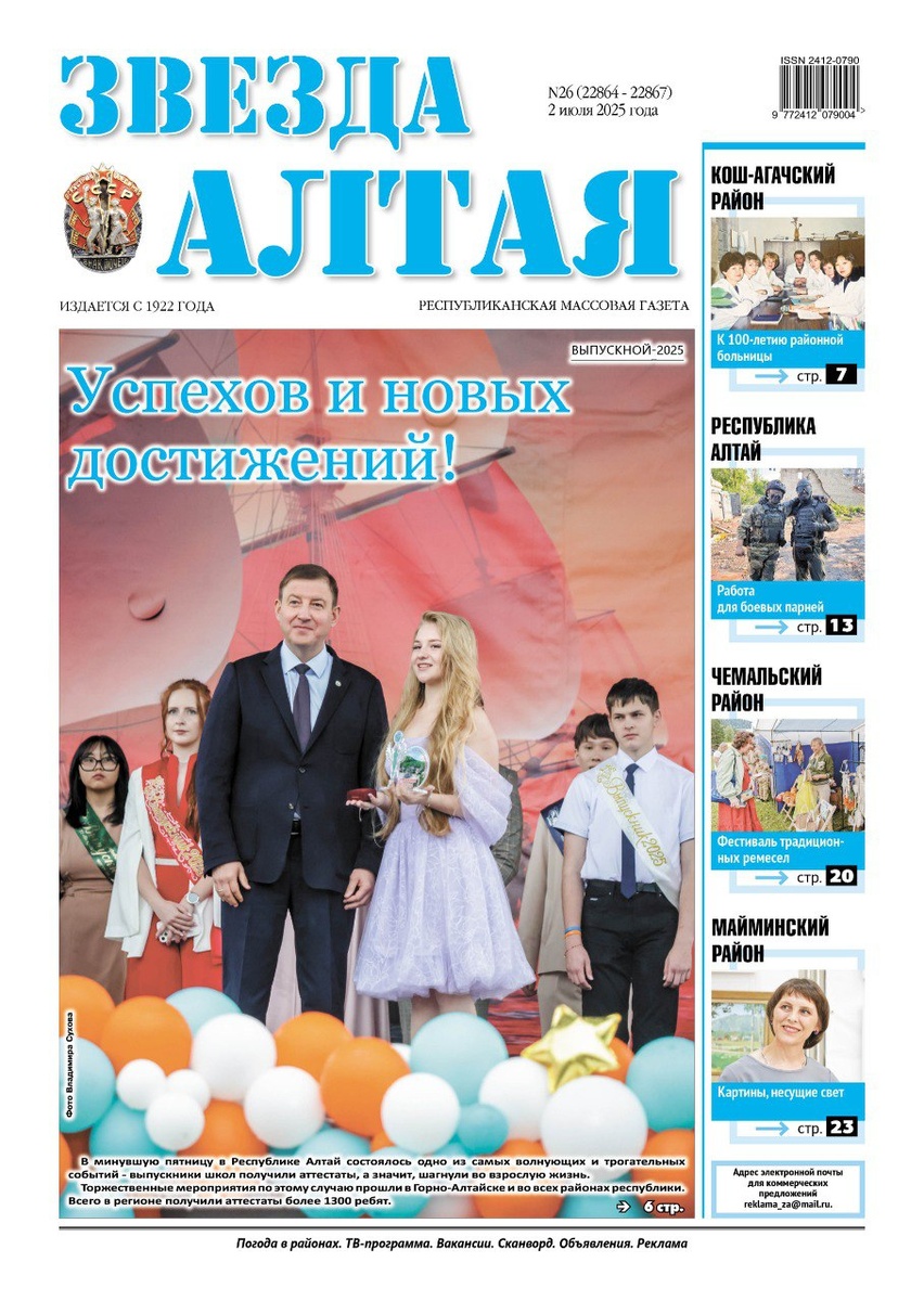 ⭐️Свежий номер «Звезды Алтая» уже поступил в продажу! 🔹Наш великий и царственный Алтай... В канун Дня республики вспоминаем, как зарождался наш регион. 🔹Работа для боевых парней. О фронтовых буднях нашего земляка, младшего сержанта Никиты М. 🔹Проект "Литературная терраса. Страна за Тугаей" на прошлой неделе снова собрал поэтов и музыкантов для творческого общения и ярких выступлений. О том, как это было, читайте в номере. 🔹В Майме состоялась ХХ Летняя Олимпиада спортсменов Республики Алтай. Об этом - уже в газете! 🔹Прошлые выходные были яркими и событийными. День молодежи, выпускные - это было красиво, молодо, трогательно. Подробнее читайте в нашем репортаже. 🗞☕В новом выпуске нашей газеты вы найдёте много интересной и актуальной информации! 💫Спрашивайте газету в магазинах города. Приобрести ее можно и непосредственно в редакции (Горно-Алтайск, ул. Чорос-Гуркина, 38).