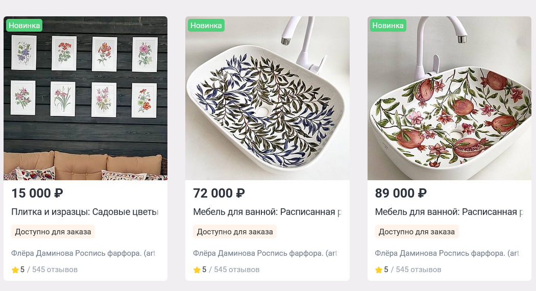 Все созданы в моем фирменном стиле, и в тех направлениях, с которыми я работаю постоянно. Настенные зеркала, раковины, "фартуки" для кухни, панно-картины на плитке, и конечно, сервизы - столовые, чайные, чайно-десертные.