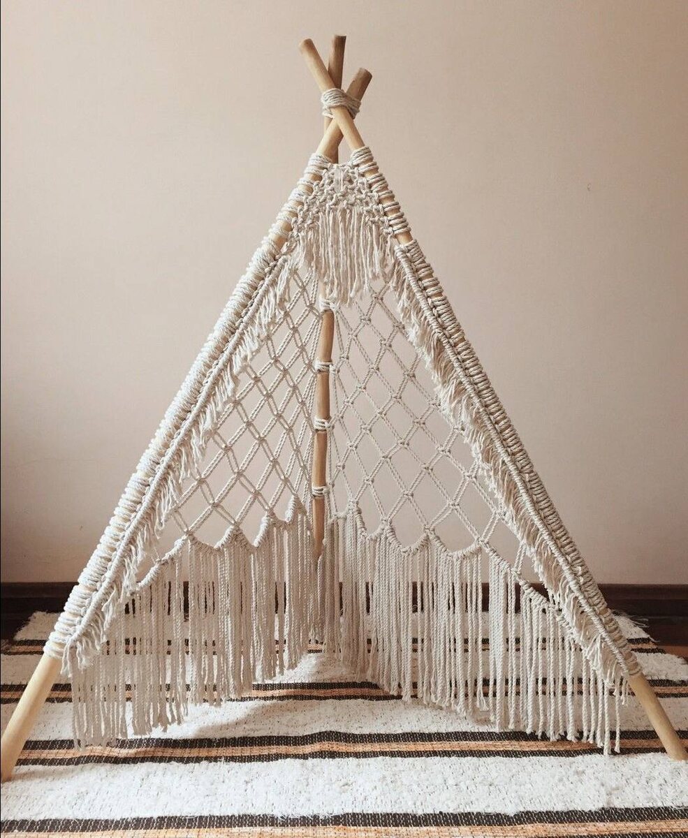 Вигвам из макраме — это не только стильный элемент декора, но и отличное место для отдыха. Дети будут в восторге от своего "домика", а взрослые оценят романтическую атмосферу, созданную в этом уютном уголке. Выбирая вигвам, обратите внимание на натуральные и экологически чистые материалы, такие как хлопок или лен. Они не только красивы, но и безопасны для здоровья.Также можно дополнительно задекорировать вигвам подушками и пледом.