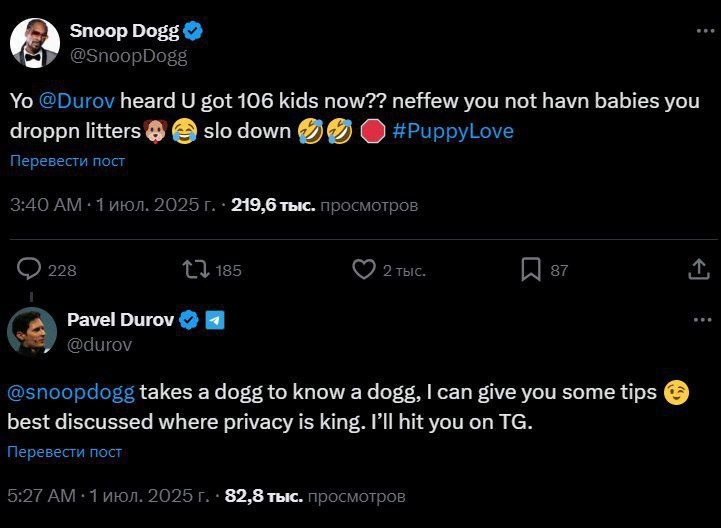 Основатель Telegram и легендарный рэп-исполнитель вступили в полемику в соцсети X. В своем посте Snoop Dogg посоветовал Дурову «притормозить» заводить детей в таком большом количестве.