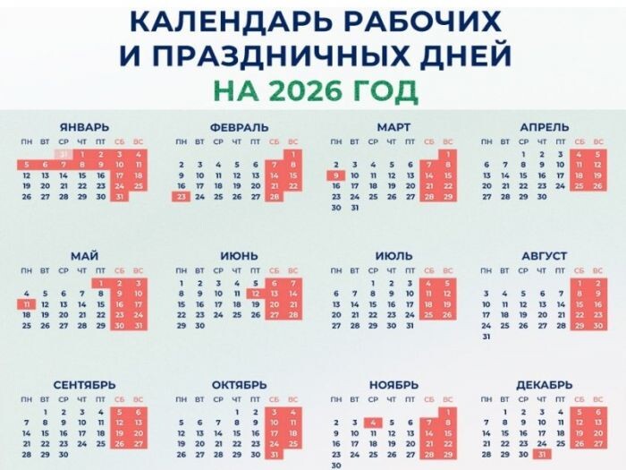 Новогодние каникулы россиян в 2026 году продлятся 12 дней Минтруд РФ опубликовал календарь рабочих, выходных и праздничных дней на 2026 год. Россиян ожидают длинные новогодние каникулы, а вот майские праздники, напротив, оказались разделены полноценной рабочей неделей. https://academ.info/news/society/47660/