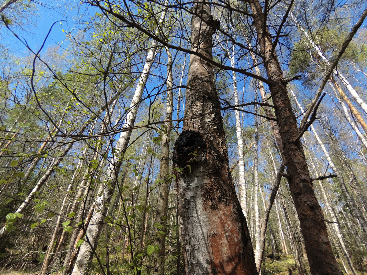 В некоторых публикациях и в разных своих блогах я говорил, что одно из моих пристрастий в плане фотографии - это фотографирование деревьев, при этом ракурс - вверх, в небо. Сложно словами объяснить, что меня в этом притягивает, что именно нравится, но почти в каждом походе, да и в городе тоже, когда в парках, делаю такие снимки. Что-то притягивает. На фото выше - чага, так это выглядит в реальных условиях, и бывают места, где в березняках этой чаги очень много, но чаще и другая ситуация встречается: идешь часами, и гриба вообще нет. Фактор удачи никто не отменял. И вот думаю я, задаюсь вопросами:"Время летит, что сделано, а что упустил, что было хорошего, а за что придется держать вселенский ответ?" Много вопросов. Понятное дело, что все это не фанатизм, не на постоянной основе, давно уже понял, для себя принял, что нужно жи ть реалиями, но и не думать о таких вещах не получается. Если копнуть поглубже, разное было в жизни, к сожалению, и не особо хорошее. И вот смотрю я в высоту, и та