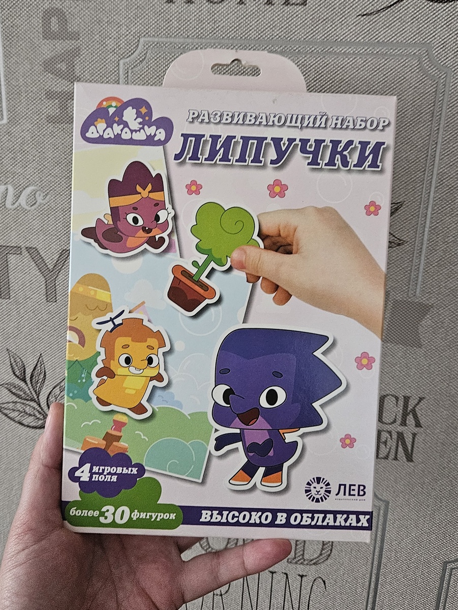 Фикс Прайс - клад таких "занимашек". Нашли там интересную бумажгую игру "Липучки". Это развивающий набор "Высоко в облаках. Дракошия". Неплохая идея, но есть один недочет. Игра настольная. Развивающий набор "Липучки". Дракошия. Высоко в облаках. Игра продается в коробочке. Вся инструкция и информация на коробке, внутри отдельной инструкции нет. В состав набор входит: ✔️Пустые поля из картона 4 шт ✔️Дракоши, которых нужно выдавить из картонной основы 4 листа ✔️Липучка на липкой основе Дочь очень быстро включилась в процесс. Правда, у нас получилась не настольная игра, а напольная 😁. Она активно выдавливала всех персонажей и все детали из ячеек. Смысл игры прост: 1. Отрезать ленту - липучку и приклеить на разметку на пустом поле 2. Выдавить фигурки и приклеить к ним вторую половинку ленты - липучки 3. Прикрепить фигурки на игровое поле. В целом, приклеивание липучки заняло минут 10. Но я сначала неправильно сделала. Начала отрезать большие полосочки и нам не хватило липучки н