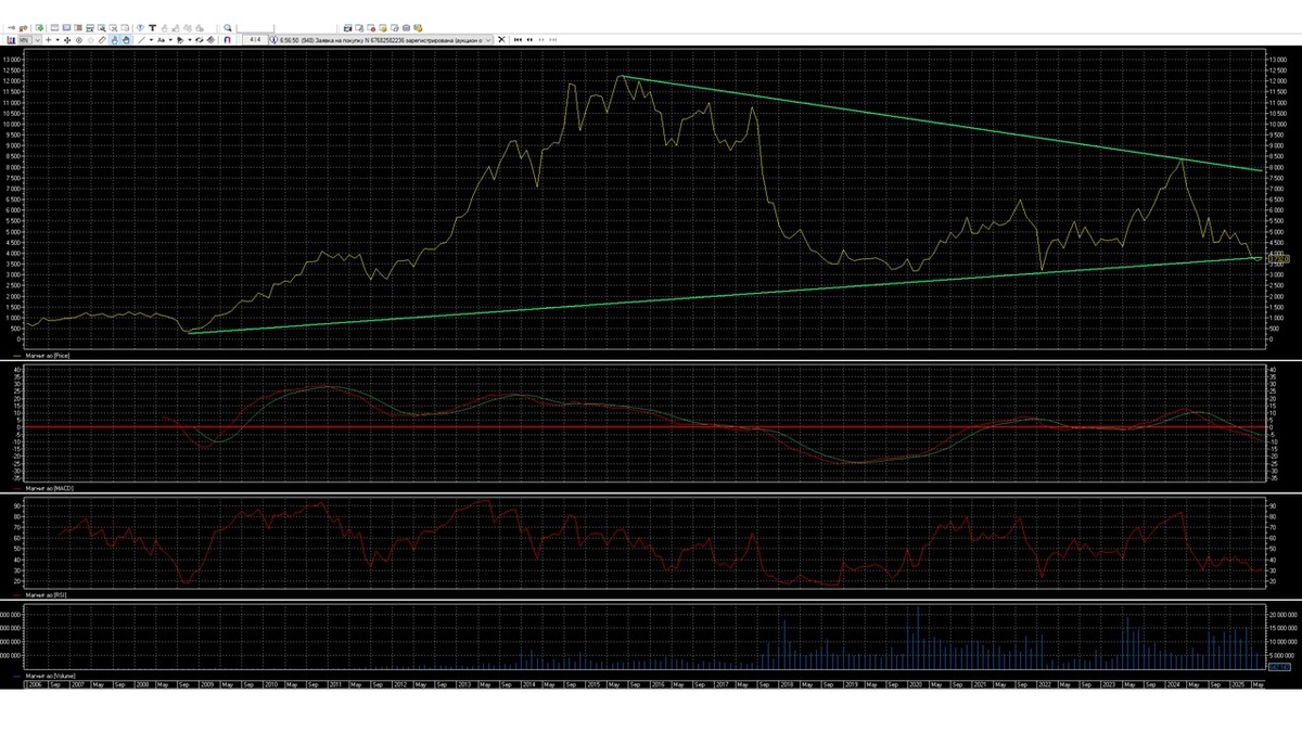 Недельный график показывает, что акция Магнит сохраняет тенденцию движения с попыткой дойти до уровня 3800. Учитывая, выход из бокового сужающегося коридора сверху вниз, где произошла остановка просадки на уровне 3600, возможно это ложный пробой или зарождение понижающегося движения вниз. Индикатор RSI сверху подошел к уровню 20%, где развернулся в сторону уровня 30% и дошел до него. Индикатор MACD располагается под нулевым уровнем и двигается вниз с попыткой сделать разворот на боковое движение. Объем торгов продолжает показывать минимальную активность инвесторов в акции, без признака их прихода. Если увеличение торгового оборота не будет видно на графике, движение наверх угаснет, акция может начать идти вниз.