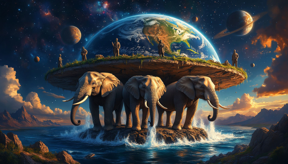 Древнеиндийские мыслители создали впечатляющую картину мира. Они считали, что Земля представляет собой огромную полусферу, похожую на купол, который удерживают на своих спинах четыре могучих слона. Слон стоит на гигантской черепахе, плавающей в мировом океане, состоящем из молока. Черепаху, слонов, землю и небо обвивает великая тысячеголовая чёрная кобра. Она же удерживает всю Вселенную.