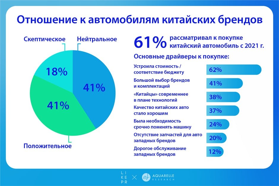 Вот и наступила следующая стадия принятия - оказывается, уже 52% россиян готовы рассматривать к покупке китайскую марку даже в случае возвращения европейских брендов. Об этом говорится в исследовании компаний Aquarelle Research и LikePR, которые провели соответствующий опрос 1000 автовладельцев в мае 2025 года. Главные выводы: ✅ 41% россиян уже положительно относятся к китайским автомобилям, ещё 41% занимают нейтральную позицию и лишь 18% остаются скептически настроенными. ✅ Основными причинами покупки "китайца" были названы доступная цена, широкий модельный ряд и технологичность. Почти половина участников отметила заметное улучшение качества материалов и электроники, а треть опрошенных говорит о повышении безопасности и ресурсе. ✅ Уже 74% готовы купить или рассматривают к покупке китайский автомобиль, причем наибольшее доверие к китайским авто проявляют молодёжь до 25 лет, а также жители мегаполисов и... Дальнего Востока (последнее утверждение настолько неожиданно, что ставит под