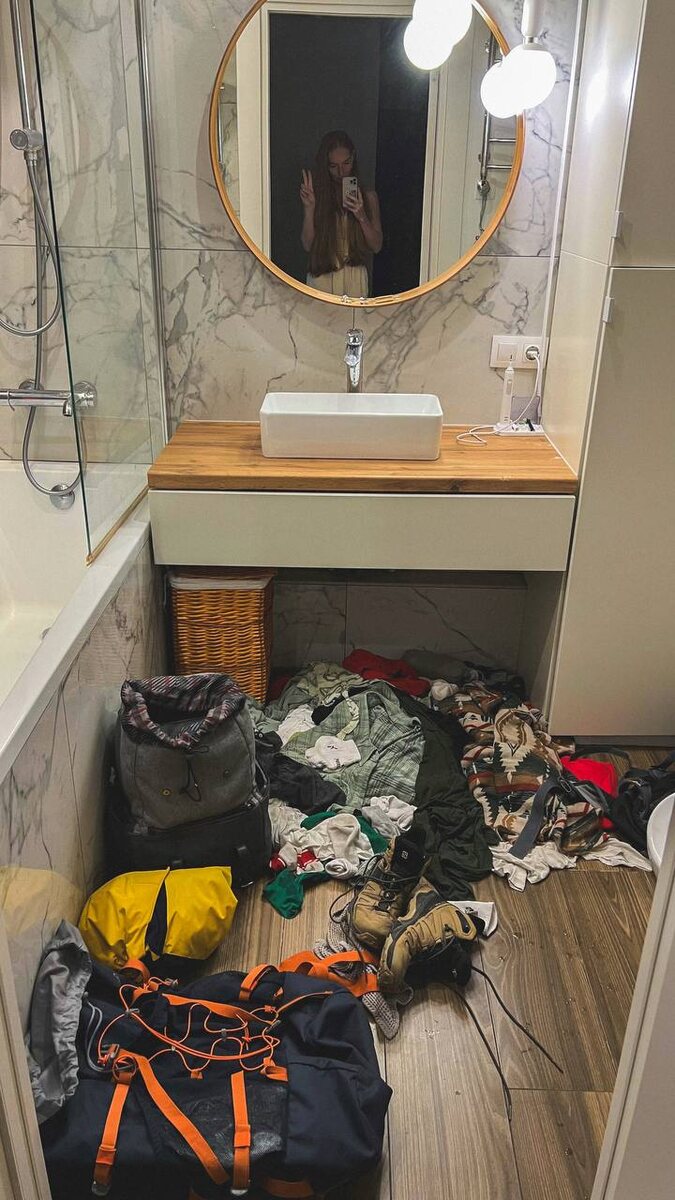 Сегодня мы к вам с шок-контентом😬 Так сейчас выглядит квартира… Вернулись из путешествия и третий день не можем разобрать рюкзаки. Надеюсь, в гости к нам никто не собирается🤭