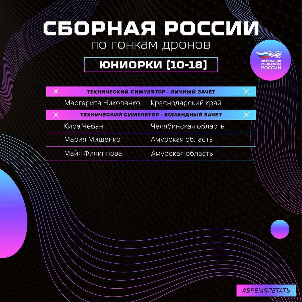 — Отличная новость сегодня - сформирована сборная России по гонкам дронов (https://t.me/droneracingfederation/2952) и в неё вошли четыре представителя из Белогорска! — отметил глава города. — Это Арина Пархомова (класс 200 мм, личный зачет); Екатерина Лунина (технический симулятор, личный зачет); Мария Мищенко (технический симулятор, командный зачет); Майя Филиппова (технический симулятор, командный зачет). Всего в сборной России 43 спортсмена из 12 регионов страны. Она сформирована по итогам 2024 года. (https://t.me/smeliukov/1217) Дальний Восток представлен только Белогорском, а из всех 12 российских спортсменок четверо наши. Поздравляю! Думаю, что это и есть результат нашей работы и постоянного внимания губернатора Василия Орлова к развитию беспилотных компетенций.