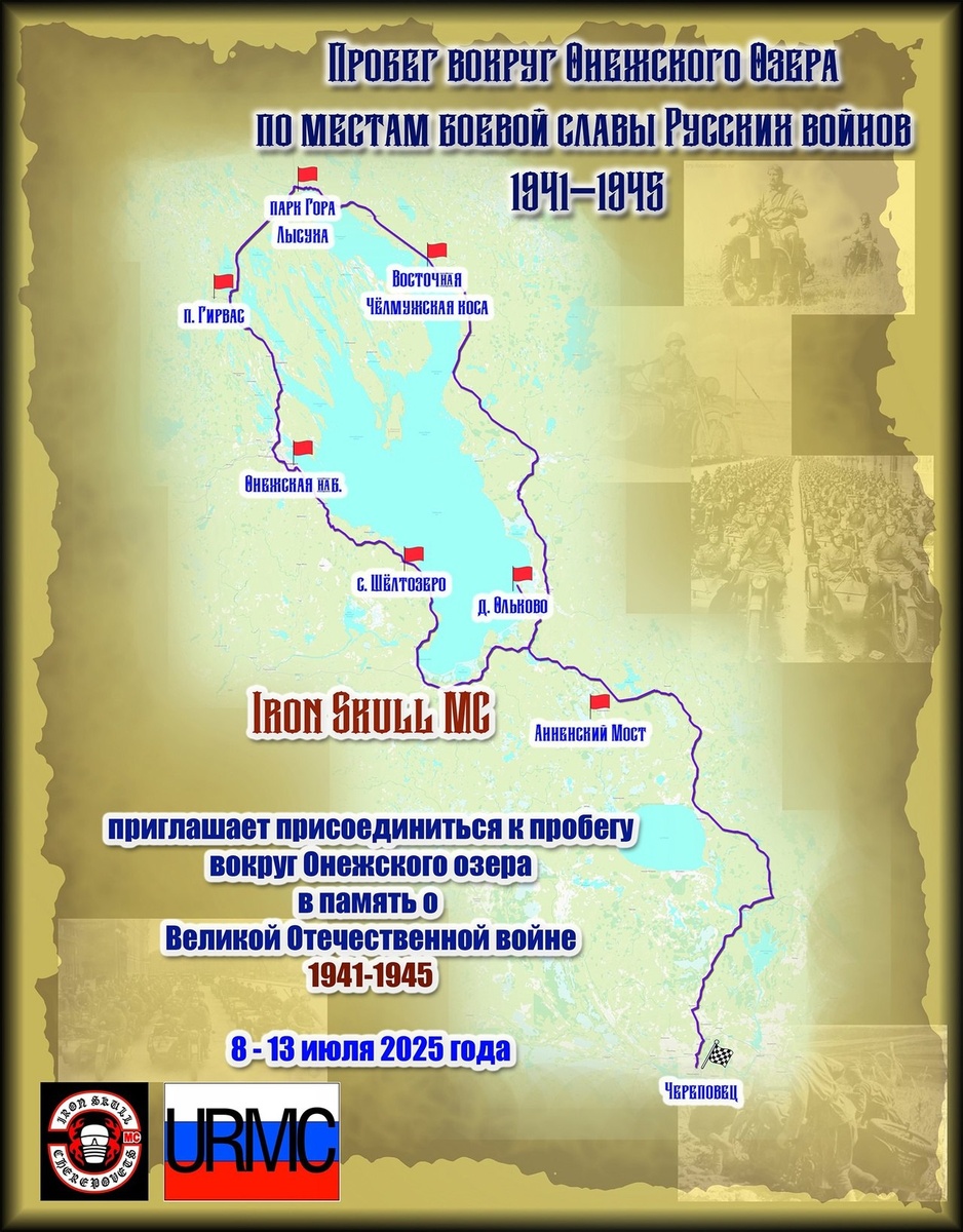 🔁 Дальняк.рф™: Друзья! С 8 по 13 июля Клуб " IRON SKULL" МС приглашает всех желающих присоединиться к мотопробегу по местам боевой славы Медвежьегорского района. 23 июня 1944 г. Красная армия штурмовала Финский Медвежьегорский укрепрайон. Героизм был массовый, за мужество и отвагу большинство советских воинов были награждены орденами и медалями. Главные бои были в Медвежьегорске. Возложить цветы к мемориалу павших воинов - это самое малое, что мы можем сделать. Клуб "IRON SKULL" МС своим пробегом хочет отдать дань памяти нашим воинам. Вы можете присоединиться к пробегу в любой точке наших остановок. Главное - вместе быть в Медвежьегорске. Формат простой: что в кофрах привезли, то и съели. Вас ждут общение, дорога, красивые Карельские пейзажи и память о былых подвигах советского солдата. Вся информация по организации Сергей "Мелкий" т. 89211309681