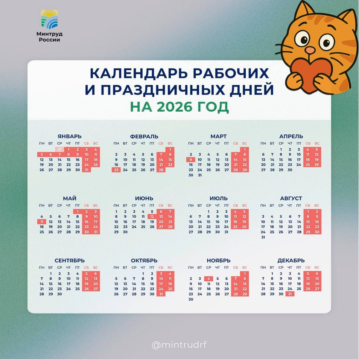 ☃️ 12 дней, чтобы спланировать и отметить зимние праздники Минтруд России разработал проект календаря праздничных и выходных дней на 2026 год. Проект постановления разместили на общественное обсуждение. Согласно предложенному графику, новогодние каникулы продлятся 12 дней (с 31 декабря 2025 года по 11 января 2026 года). Для рыжего кота 12 дней сна и ничегонеделания – это прекрасно. А что думаете вы? ❤️ — в самый раз; 🗿— слишком много; 😢 — мало, надо ещё. @relaxsaratov