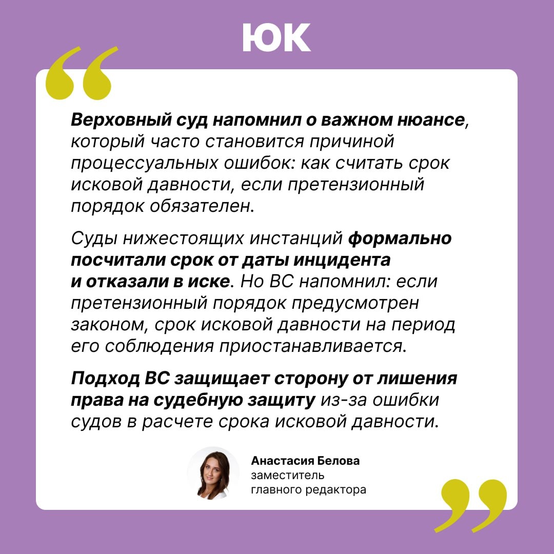 ВС пояснил, как считать срок исковой давности, пока сторона рассматривает претензию Предприниматель обратился с иском к перевозчику после того, как возместил убытки собственнику сгоревшего груза. ✨ Верховный суд отменил акты нижестоящих инстанций, которые отказались удовлетворить иск, сочтя, что предприниматель пропустила годичный срок исковой давности: происшествие случилось 18 января 2022 года, а иск поступил только 21 февраля 2023 года. По их мнению срок исковой давности истек 19 февраля 2023 года. ВС указал: по спорам между участниками перевозки обязателен досудебный порядок, и на время его соблюдения течение срока исковой давности приостанавливается. ➡️ В данном случае претензию направили 16 января 2023 года, а ответ на нее получили 21 февраля. Значит этот период в расчет срока не входит. Предприниматель успела подать иск в пределах срока исковой давности (Определение ВС от 18.06.2025 по делу № А40-37322/2023). Мнение редакции смотрите в карточке. ↖️ О других важных позиц