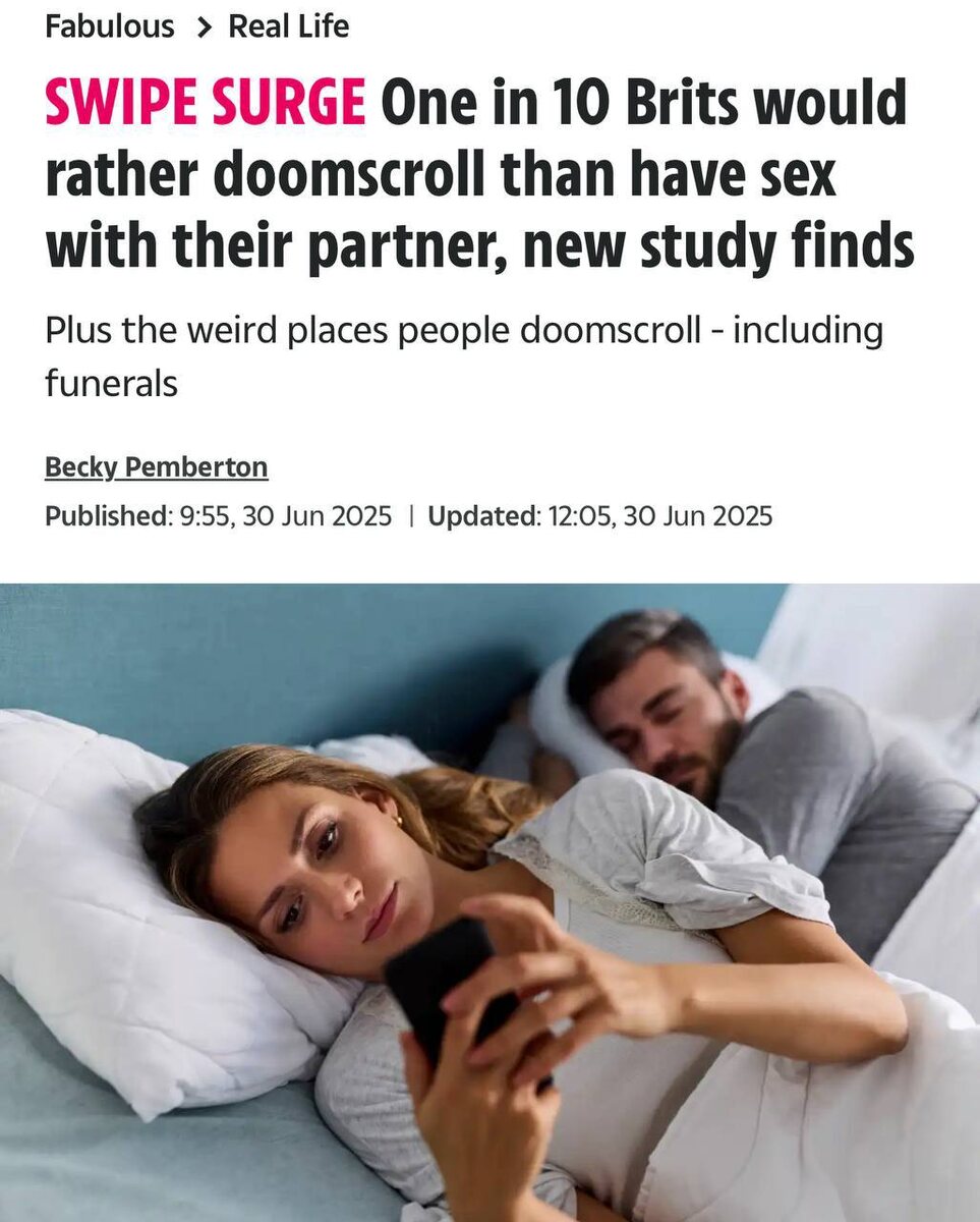 Люди все чаще отказываются от секса, чтобы посмотреть рилсики и поскроллить ленту перед сном 💻 Исследование показало, что каждый десятый человек предпочтет соцсети сексу. В среднем на бессмысленное листание уходит полтора часа в день — и лишь половина признает, что это мешает жить и работать. Сегодня никаких тиктоков на ночь!