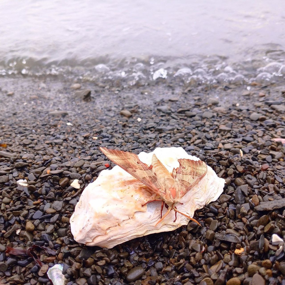 — Утро играет красками на фоне моря. Нежные волны ласкают гладкий галечный берег. Рядом, сверкая белизной, створка устрицы, а на ней — яркая бабочка-бражник, словно проблеск чудесного в необычном. Мгновение, полное жизни и красоты. Чтобы волны не утащили его, аккуратно его отнес подальше от моря, посадил на куст шиповника, и бражник сразу улетел, — написал нам Сергей.