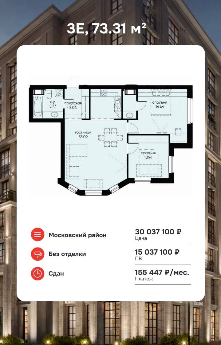 Комбо-ипотека в проекте на Московском проспекте! Программа даёт возможность оформить cемейную ипотеку с суммой кредита более 12 млн. ₽ (max - 30 млн. ₽) по средневзвешенной ставке. Fix стоимость м² — 410 000 ₽ Расчет по программе: • цена — 30 037 100 ₽ • ПВ — 15 037 100 ₽ • ставка от Сбера — 12.1% • платеж — 155 447 ₽/мес. За подробностями жду 👉 http://wa.me/79211850970
