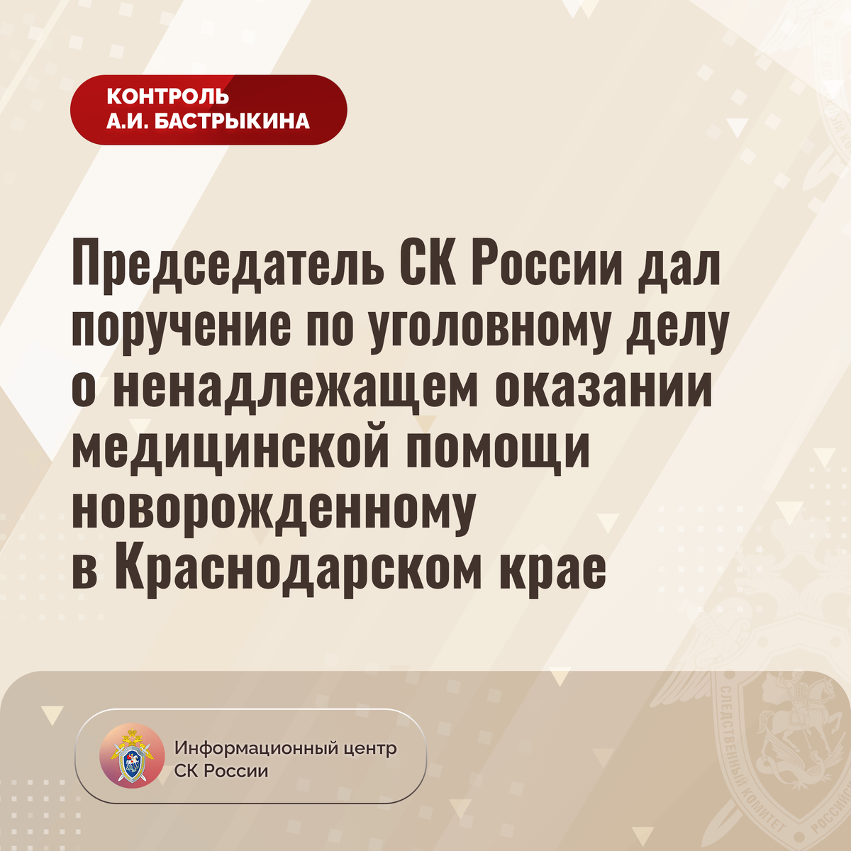 Председатель СК России дал поручение по уголовному делу о ненадлежащем оказании медицинской помощи новорожденному в Краснодарском крае