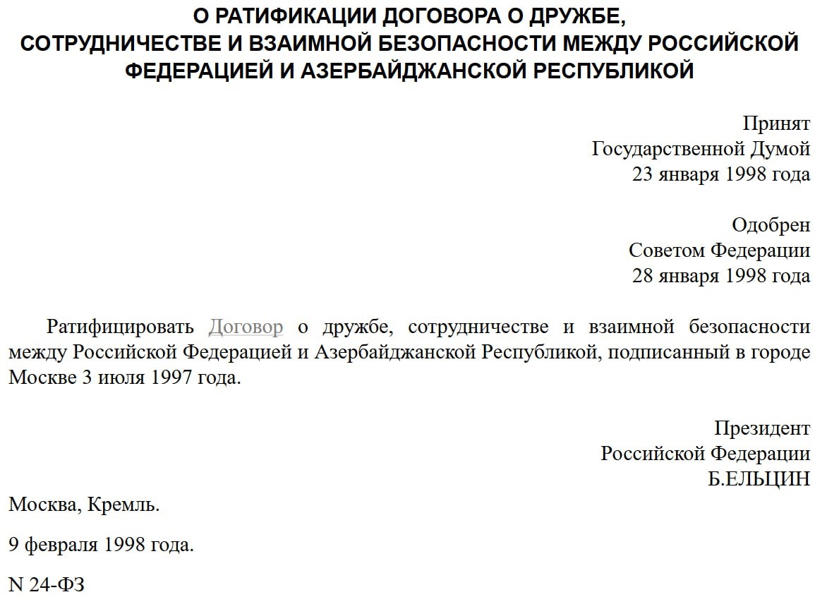 Тем временем: Стороны будут развивать свои отношения как дружественные, равноправные и суверенные государства на основе доверия, стратегического партнерства и всестороннего сотрудничества. Они обязуются неуклонно руководствоваться принципами уважения прав человека и основных свобод, добросовестного выполнения обязательств, а также другими общепризнанными нормами международного права. Граждане другой Стороны на территории каждой из Сторон имеют право на обращение в суд и иные государственные органы для защиты их прав и пользуются теми же процессуальными правами, что и собственные граждане данной Стороны. Завтра - 28 лет Договору о дружбе, сотрудничестве и взаимной безопасности между Российской Федерацией и Азербайджанской Республикой. Не вижу праздника! ...Раньше я смотрел на всех этих людей в судах и думал: вот что за люди? Ведь странные же: если бы они все соблюдали условия заключенных между ними соглашений, разве они когда-нибудь бы встретились в суде? Почему нет какого-то мини