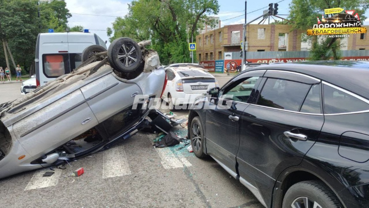 В Благовещенске на пересечении улиц Мухина и Амурской произошло массовое ДТП - столкнулись сразу пять легковых автомобилей. Один из них перевернулся и оказался на крыше, другой врезался в фонарь. На месте работает скорая. #АОТВ Фото: подписчики АОТВ