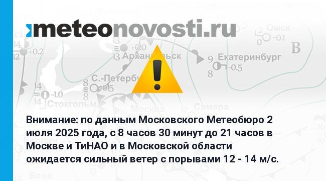 Внимание: по данным Московского Метеобюро 2 июля 2025 года, с 8 часов 30 минут до 21 часов в Москве и ТиНАО и в Московской области ожидается сильный ветер с порывами 12 - 14 м/с. Перейти на сайт Прогноз погоды на 14 дней