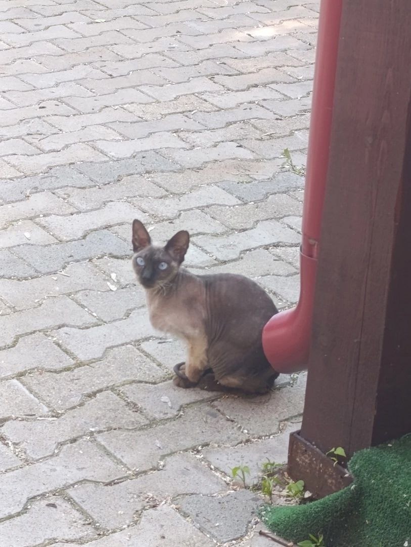 Лысая кошечка ещё весной пришла за помощью в частный сектор. Она была беременная и сильно замёрзла.