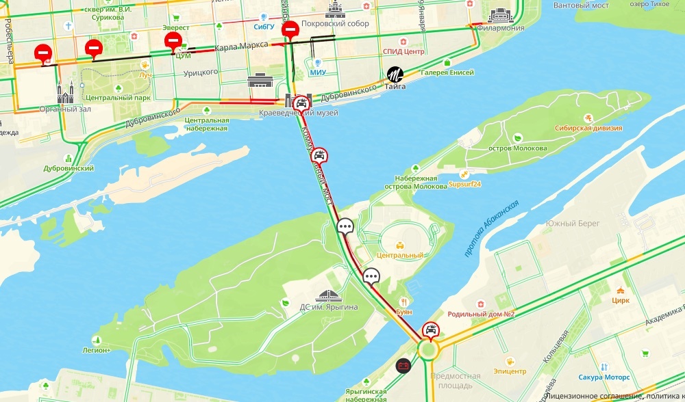 В Красноярске мотоциклист на Коммунальном мосту пытался проехать между рядами и на скорости влетел в автомобиль. Видео аварии опубликовали в «ЧП Красноярск». На кадрах видно, как мотоциклист на скорости летит по мосту между рядами, объезжая автомобили. В какой-то момент он вновь решает поменять ряд, но задевает одну машину и влетает в другую. Выжил ли мотоциклист, неизвестно. В итоге из-за аварии весь Коммунальный мост встал. По словам водителей, кроме этого ДТП, на кольце Предмостной площади произошло ещё одно. Пробка растянулась на несколько километров и часов. Сейчас на картах 2GIS весь мост окрашен бордовым цветом от Предмостной площади до Краеведческого музея. фото: vk.com/kraschp.