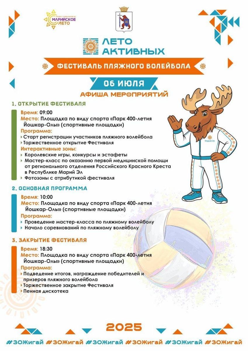 6 июля в Йошкар-Оле пройдет Фестиваль пляжного волейбола Местом проведения станет площадка Парка 400-летия Йошкар-Олы. Фестиваль стартует в 9:00, сообщил организаторы. В программе − регистрация игроков, торжественное открытие фестиваля, работ интерактивных зон (›королевские игры, конкурсы и эстафеты), мастер-класс по оказанию первой медицинской помощи от регионального отделения Российского Красного Креста, фотозоны, пенная дискотека и, конечно же, награждение победителей.