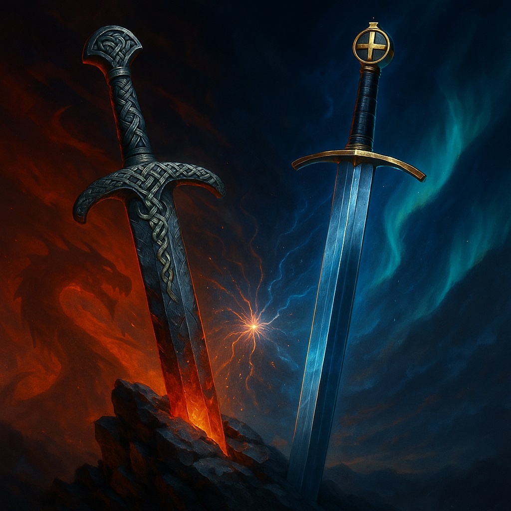 Когда кузнец вынимает клинок из горна, воздух пахнет одновременно молоком звёзд и гарью преисподней. В этот мгновенный аромат впитывается судьба ‒ и героя, и народа, и целого века. Меч в мифе – не просто орудие боя; это быстрорежущий декантер, через который судьба наливает историю. Сегодня мы возьмём шлифовальный камень времени и проведём им от легендарного Грама, расколовшего дракона, до короля Олафа, мечом расколовшего идола, – чтобы понять, как холодная сталь превращает кровавую хронику в бессмертную симфонию.