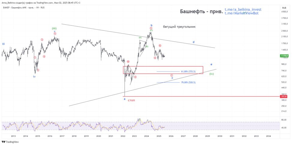 Графики из видео по обзору нефтяного сектора: https://dzen.ru/media/id/65b8789ff12bfe0796a26941/video-6862db75abd16730d7935692 #нефтяники #BANEp #1W Башнефть привилегированные Аналогично, развивается коррекционное движение вниз в субволне c of (iv) треугольника. После коррекции можно ожидать восходящего движения. Не является ИИР 💪 Бот Закрытого Канала