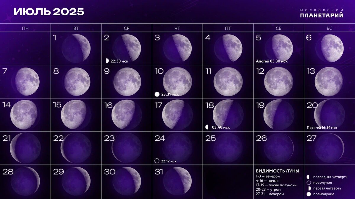 05 июля (05:30 мск) – Луна в апогее своей орбиты на расстоянии 404626 км от Земли
