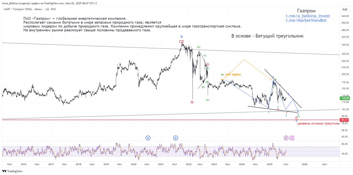 Графики из видео по обзору нефтяного сектора: https://dzen.ru/media/id/65b8789ff12bfe0796a26941/video-6862db75abd16730d7935692 #GAZP #нефтяники Газпром Всё еще ожидаем завершения снижения в Газпроме, где для полной комплекции структуры КД по-прежнему не хватает 2-х низов. Не является ИИР 💪 Бот Закрытого Канала