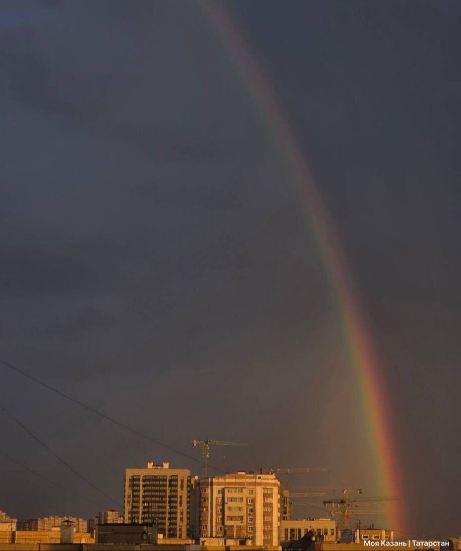 Местные жители поделились кадрами яркой радуги. По словам очевидцев, радуга появилась на рассвете на фоне темных туч.