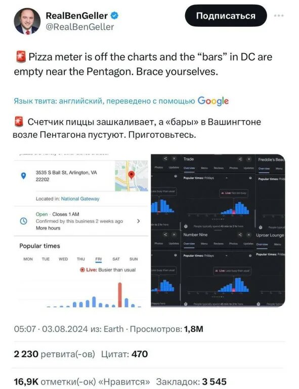 Обычно важные события не анонсируются заранее и происходят внезапно для большинства граждан. Мы просто не знаем, что происходит за закрытыми дверями высоких кабинетов, какие обсуждения, споры и решения там разворачиваются. Именно в такие моменты, возможно, закладываются события, которые способны изменить ход мировой истории. Но что если я скажу, что уже давно существует неформальный, почти партизанский инструмент, который позволяет заранее почувствовать приближение таких переломных моментов? Причём этот инструмент не имеет ничего общего с официальной статистикой, утечками или инсайдерской разведкой. Он куда проще, но в своей простоте гениален. Его называют индексом пиццы и гей-клубов около Пентагона, и, как ни странно, он способен подсказать, когда на международной арене что-то готовится. Индекс родился как шутка на стыке военной аналитики и культурных мемов, но в каждой шутке, как известно, есть доля правды. В Вашингтоне, особенно в районе Арлингтона и округа Колумбия, расположены со