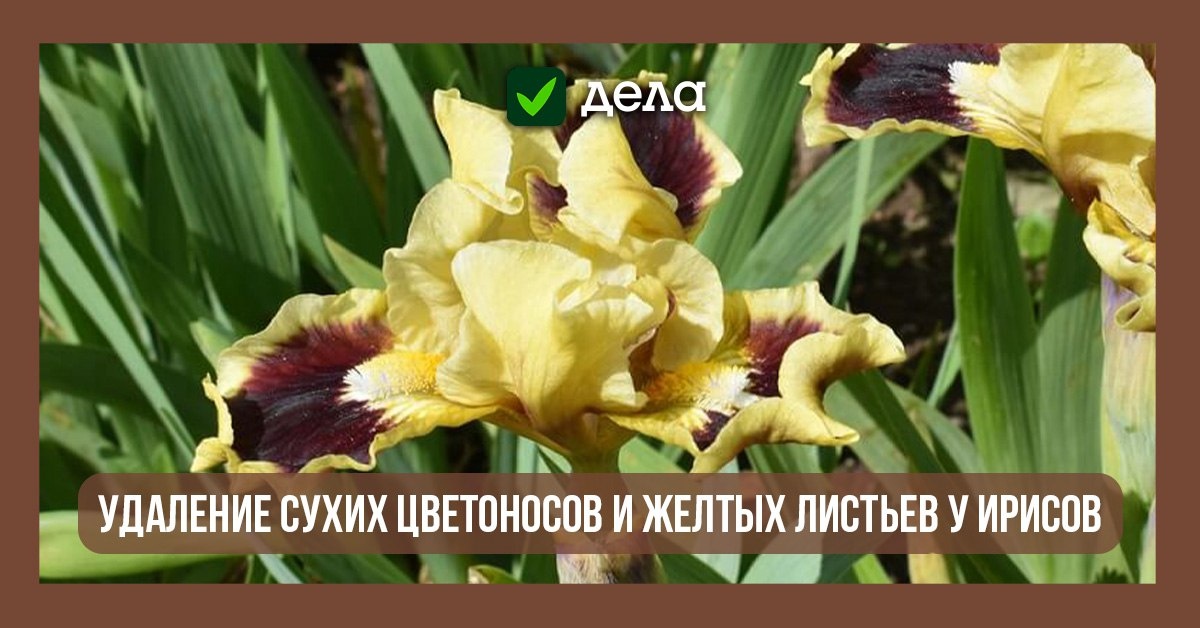 Удаление сухих цветоносов и желтых листьев у ирисов 💐 По мере отцветания осматривайте кусты и выламывайте или срезайте у основания засохшие цветоносы, больные или пожелтевшие листья. 💐 Делайте это утром в ясный день, чистым острым секатором. 💐 Чтобы минимизировать вероятность загнивания мест срезов, присыпайте их золой или толченым углем.