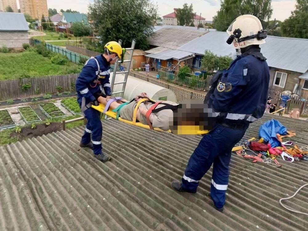 В Кунгуре благодаря помощи спасателей удалось снять с крыши жилого дома мужчину. Происшествие случилось 1 июля утром. В оперативную службу ЕДДС позвонили очевидцы и рассказали, что на крыше находится человек в неадекватном состоянии. Прибывшие спасатели сначала пытались уговорить мужчину слезть с крыши. Но он отказался это делать. Тогда один из спасателей поднялся на крышу, силой схватил его. После этого подоспели другие спасатели. Они связали неадекватного мужчину, уложили на носилки и спустили с крыши. Мужчину передали бригаде скорой помощи.