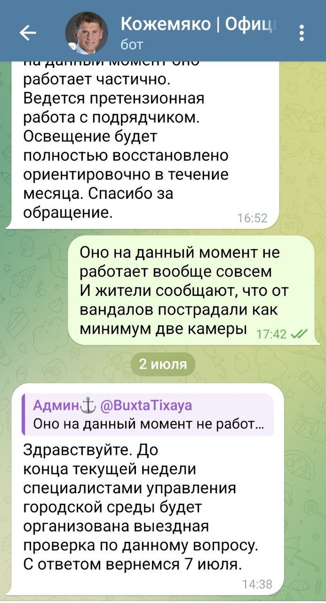 В ответ на пост 💡Продолжаем диалог с чат ботом Кожемяко, конечно же про освещение на аллее космонавтов😀 Кожемяко | Официально | Здравствуйте. До конца текущей недели специалистами управления городской среды будет организована выездная проверка по данному вопросу. С ответом вернемся 7 июля. ❗️Кто заметит специалистов-проверяющих, просьба запечатлеть. 📍@yurovmedia