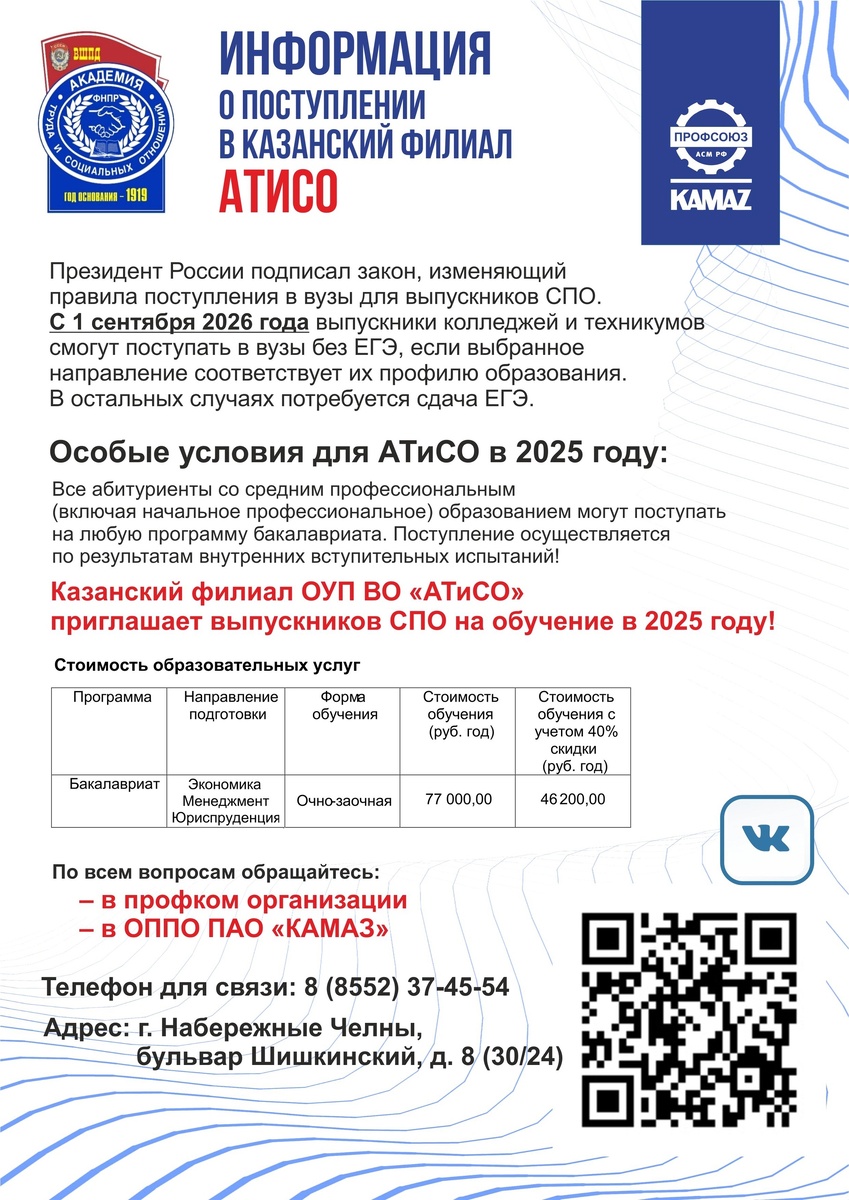 ИНФОРМАЦИЯ О ПОСТУПЛЕНИИ В КАЗАНСКИЙ ФИЛИАЛ АТиСО