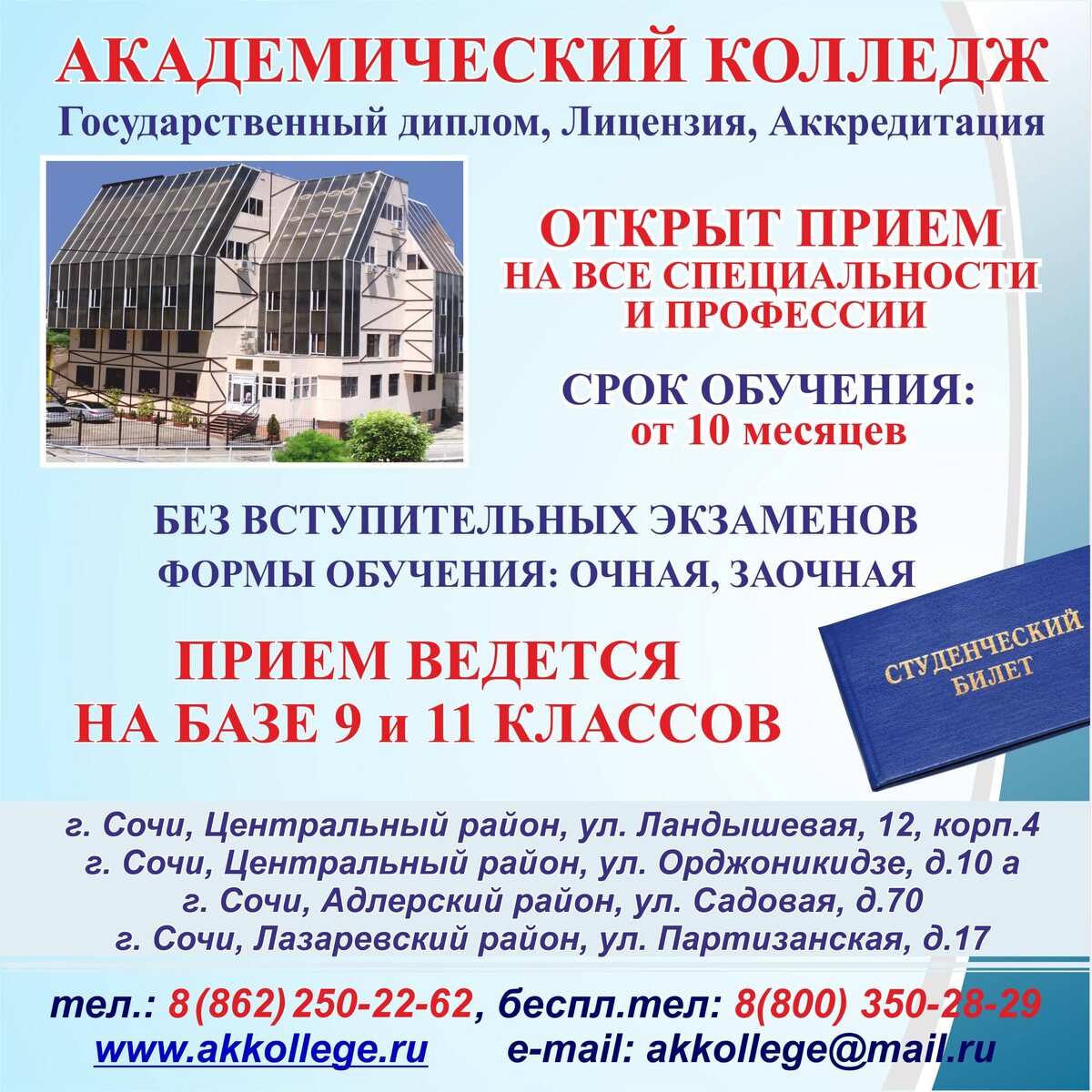 📣 Старт приёмной кампании 2025!!! 🎓 ПРОФЕССИИ: Мастер садово-паркового и ландшафтного строительства, Официант, бармен. СРОК ОБУЧЕНИЯ - 10 месяцев 🎓 СПЕЦИАЛЬНОСТИ: Сетевое и системное администрирование, Туризм и гостеприимство, Юриспруденция, Гостиничное дело, Экономика и бухгалтерский учет (по отраслям), Организация перевозок и управление на транспорте (автомобильном), Садово-парковое и ландшафтное строительство. 🔔 Мы ждём в стенах нашего колледжа будущих профессионалов! Вы можете задать все интересующие вас вопросы, позвонив в Приёмную комиссию АК по телефонам: 8 (862) 262-08-32, 8 (862) 262-00-09, бесплатный номер (по России): 8 (800) 350-08-29, e-mail: sochi.priem@mail.ru Узнать про льготы по оплате и многое другое можно также на нашем сайте 🌐 https://akkollege.ru/ https://t.me/akademicheskii_kolledzh 🎓 Поступайте правильно! Ждем вас!