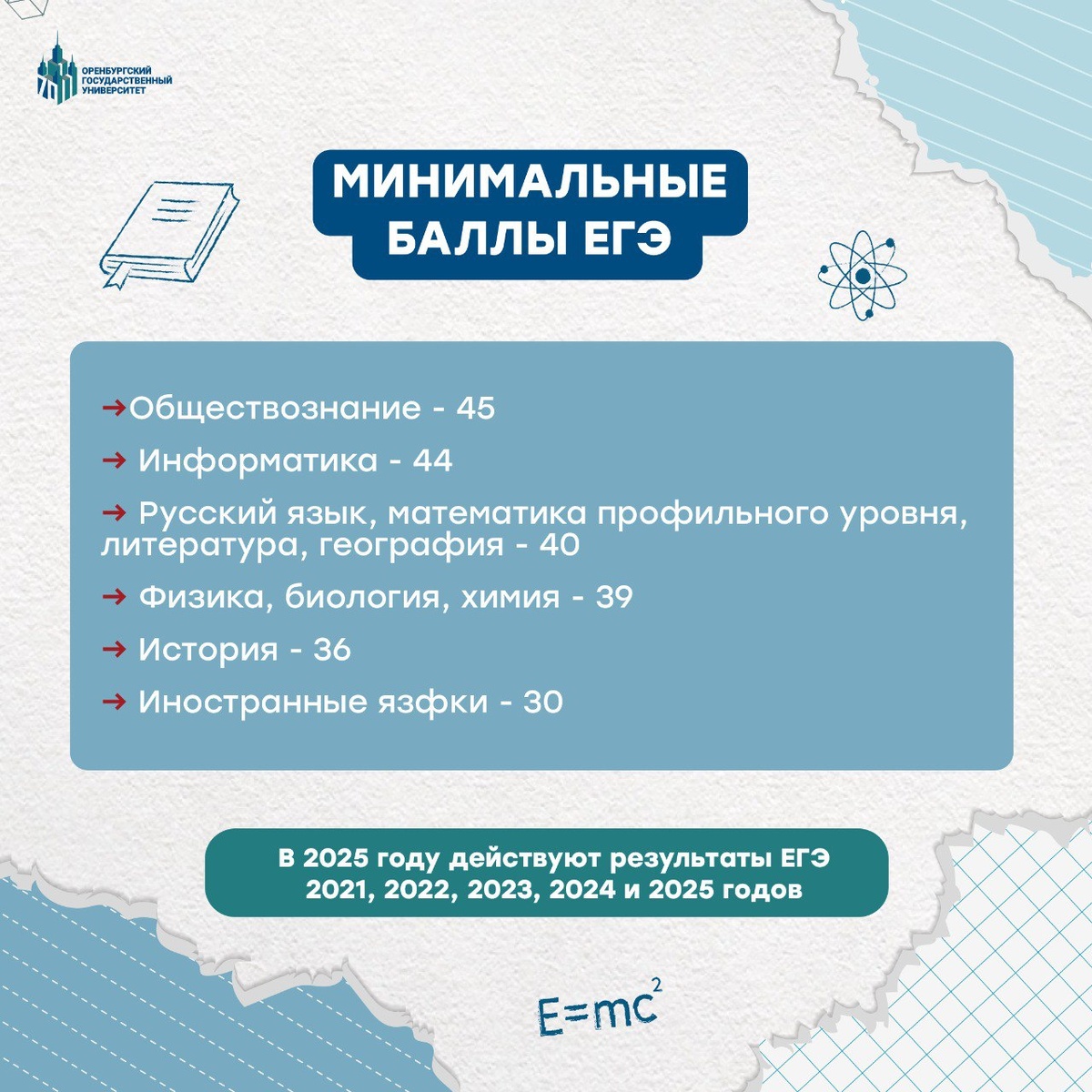 #АбитуриентОГУ2025 Уже сдал ЕГЭ, но не знаешь минимальные баллы для поступления в ОГУ в этом году? Сейчас всё объясним!👌 Минимальное количество баллов по общеобразовательным предметам, необходимое для поступления, представлено на карточке. Весь перечень вступительных испытаний в приоритетной последовательности и с указанием минимального количества баллов для участия в конкурсе можно найти на сайте. ❌ Если балл абитуриента ниже минимума хотя бы по одному предмету, он не сможет подать документы даже на платное место. Выход - подать документы в другой вуз, где баллы ниже, либо поступать в колледж. Мы в тебя верим, дорогой абитуриент! До встречи в ОГУ 💙 #в_ОГУ #ОГУ #OSU #АбитуриентОГУ2025