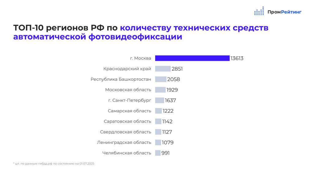 Аналитическое агентство «ПромРейтинг» опубликовало свежие данные о количестве технических средств автоматической фото- и видеофиксации нарушений на российских дорогах. Согласно отчёту, на 1 июля 2025 года Саратовская область заняла 7-е место в общероссийском рейтинге, прибавив сразу 98 новых камер за полгода и поднявшись на одну позицию. В первой шестёрке — без изменений. Как и в начале года, лидируют Москва, Московская область, Республика Башкортостан и ещё три региона. Причём в Москве, Подмосковье и Башкортостане количество камер с января не изменилось. Восьмую строчку заняла Свердловская область (+91 камера), девятую — Ленинградская (-1 устройство), а замыкает десятку Челябинская область, потерявшая 51 камеру по сравнению с началом года. Наибольший рост фотовидеофиксации показали: Красноярский край — +180 камер;