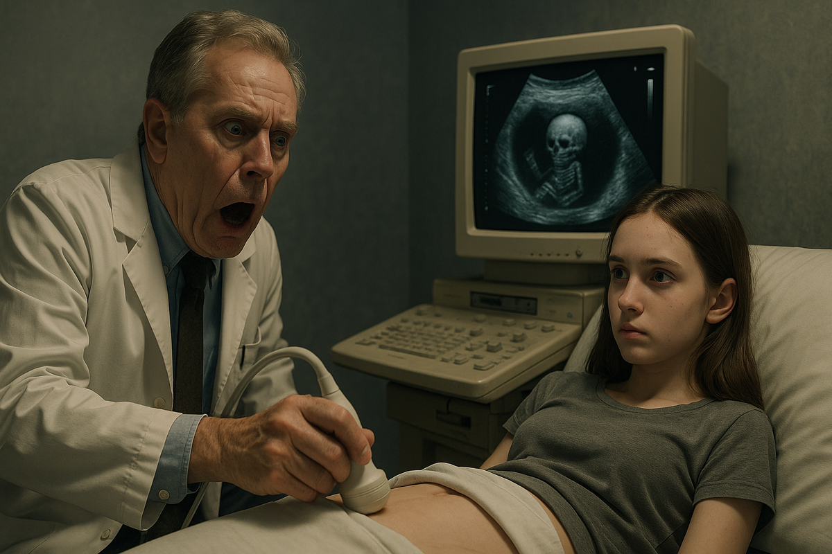 Доктор Виктор Андреевич был опытным специалистом. За тридцать лет работы в районной больнице он повидал многое. Но то, что он увидел на мониторе УЗИ-аппарата, заставило его сердце замереть. Перед ним сидела обычная, на первый взгляд, пятнадцатилетняя девочка — Алина. Худощавая, со слегка бледной кожей и большими серыми глазами. Мать привела её на обследование из-за странных жалоб: боли в животе, ночные кошмары, слабость. — Это просто возрастное, — усмехнулась мать, — подростковый гормональный сбой. Но когда доктор включил УЗИ, он застыл. На экране, глубоко под тканями брюшной полости, он увидел нечто… не поддающееся объяснению. — Это невозможно… — прошептал он. Внутри Алины, словно свёрнутое кольцо, лежал крошечный человеческий скелет. Полноценный. Сформированный. С застывшей улыбкой на крошечном черепе. Доктор резко выключил аппарат и медленно поднял взгляд на девочку. Она сидела спокойно, но как будто… наблюдала за ним слишком внимательно. Не по-детски. Как будто знала, что о