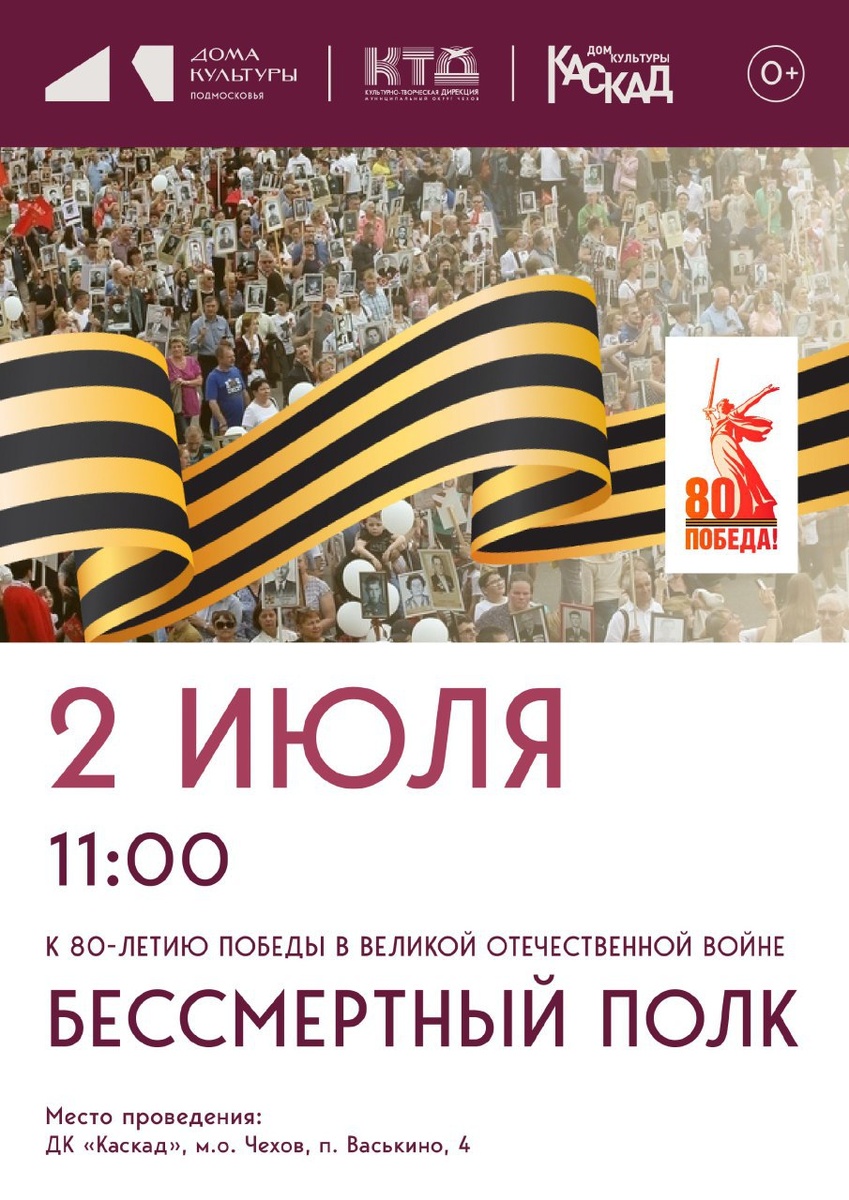 ✨ 🎯 Участие в исторической эстафете поколений! Приглашаем всех желающих присоединиться к торжественным мероприятиям, посвящённым знаменательной дате — 80-летию Великой Победы. Мы подготовили цикл специальных программ, направленных на сохранение памяти о великом подвиге наших предков и воспитание патриотического духа среди молодёжи и старшей аудитории. 🔥 Вас ждёт увлекательное путешествие в историю страны, знакомство с судьбами героев, воспоминаниями ветеранов и возможность ощутить гордость за нашу общую Победу! ⏳ Программа состоится: ✅ Дата: 2 июля 2025 г. ✅ Время начала: 11:00 часов ✅ Место проведения: ДК “Каскад”, Московская область, город Чехов, посёлок Васькино, дом №4. 🤝 Вход свободный! 👉 Прислать новость 💥 Проект "Чехов Детям"