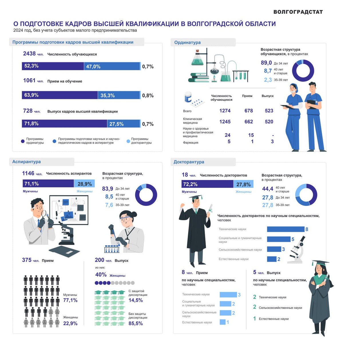 ➡️ По данным Волгоградстата, в 2024 году в аспирантурах обучалось 1146 человек, из них на очной форме обучения – 92,1%. Из аспирантуры были выпущены 200 высококвалифицированных специалистов, 14,5% - с защитой диссертации.