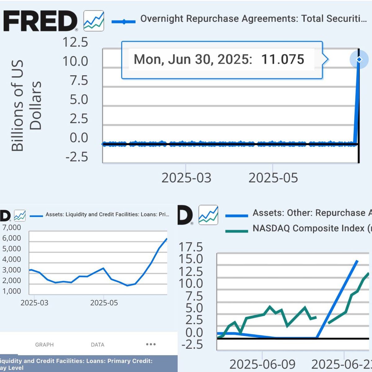 Рынок не реагирует. Он следует. 30 июня 2025 ФРС неожиданно вбросила $11 млрд через механизм репо. Это первый подобный вброс с начала года — и он совпал с резким ростом NASDAQ. На графике видно: — объём репо скакнул с нуля до $11 млрд за сутки — параллельно с этим — рост активов в кредитных программах — и почти синхронный отскок фондового рынка Что это значит? Фондовый рынок — это не опросник эмоций, это производная от ликвидности. Когда появляется долларовая подпитка, она моментально находит путь в активы с наибольшим мультипликатором. Сейчас — это техи. Причины? — Возможно, точечный кризис ликвидности (банки или фонды), который ФРС тушит репо-сделками — Или это сигнал: готовится смягчение монетарной политики на фоне нарастающих проблем с долгом В любом случае — деньги пошли, и рынок не случайно растёт. Главное, что нужно понимать: Пока вы ловите «причины» роста — смотрите на трубы, по которым в систему заходит топливо. Ликвидность = ключ. ФРС снова включила кран — значит, гот