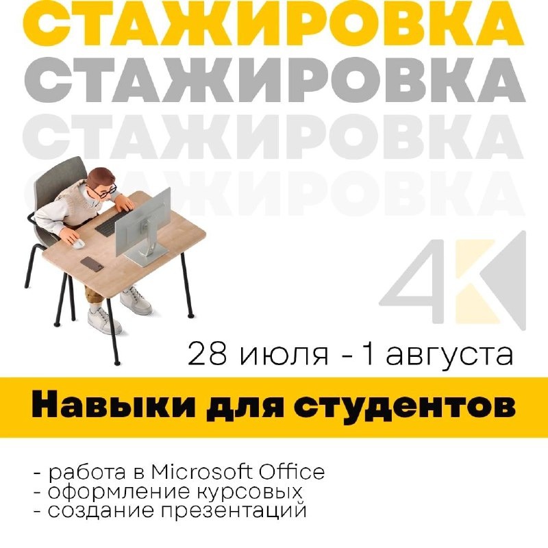 🙌🏻 Развивайте важные навыки для успешной учебы и будущей карьеры! 💻 Освойте искусство создания эффективных презентаций и научитесь профессионально оформлять курсовые работы. 🗓️ 28 июля - 1 августа Навыки для студентов 🔸 работа в Microsoft Office 🔸 оформление курсовых 🔸 создание презентаций ✍🏼 За более подробной информацией можно обратиться в сообщения сообщества или на почту prostranstvo.4k@yandex.ru