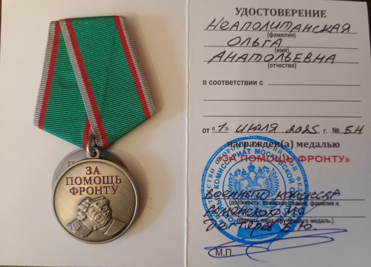 Медалью «За помощь фронту» наградили корреспондента МАУ «Раменский медиацентр» В День ветеранов боевых действий корреспонденту МАУ «Раменский медиацентр» Ольге Неаполитанской руководитель Раменского отделения Всероссийской общественной организации ветеранов «Боевое братство» Алексей Колмогоров вручил медаль «За помощь фронту». Ольга Неаполитанская – автор и ведущая программы «Правда жизни» на Раменском радио. Программа посвящена поддержке участников и ветеранов СВО, фронтовых волонтеров и семей ветеранов боевых действий. В мае этого года Ольга Неаполитанская вместе с участниками «Боевого братства» отвозила на Донбасс в одно из подразделений гуманитарную помощь. После поездки был создан фильм о «Добро». Также Ольга Неаполитанская является автором идеи создания арт-проекта «Правда жизни» по мотивам передачи на Раменском радио. Подписаться | Предложить новость