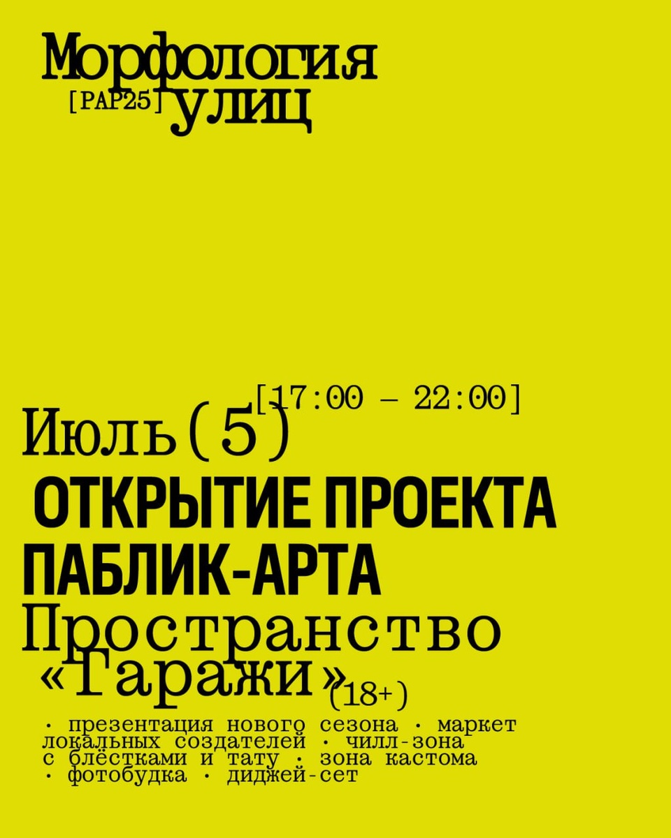 В предстоящую субботу — «Морфология» 5 июля с 17.00 до 22.00 в пространстве «Гаражи» на улице Володарского, 27/1, состоится открытие нового сезона проекта «Морфология улиц». Художники приглашают тюменцев с друзьями и семьями. В своих соцсетях они поделились, что начинать проект в «Гаражах» стало для них традицией: «Ждем, чтобы рассказать, как пройдут лаборатории в этом году. Будем покупать красивое на маркете городских создателей, кастомить одежду, обниматься и танцевать». Программа представлена в карточках. По информации организаторов