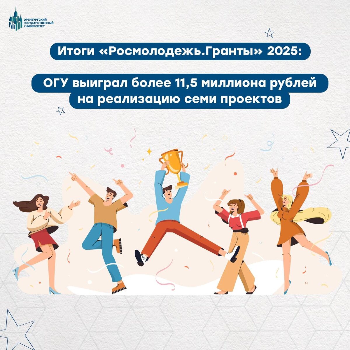 Итоги «Росмолодёжь.Гранты»: ОГУ выиграл более 11,5 миллиона рублей 😍 Федеральное агентство по делам молодёжи подвело итоги Всероссийского конкурса молодежных проектов среди образовательных организаций высшего образования в 2025 году. Наш вуз получил грант в размере 11 823 785 рублей на реализацию программы по развитию потенциала каждого студента Оренбургского государственного университета «OSUществляй мечты». В неё входят 7 проектных решений, которые будут реализованы в 2025-2026 годах. Подробнее о каждом проекте мы ещё обязательно расскажем 😉 📍Всего в текущем году для участия в конкурсе поступило 2 803 проекта из 293 вузов России, из которых 89 университетов стали победителями. #ОГУ #в_ОГУ #OSU #РосмолодёжьГранты #OSUществляй